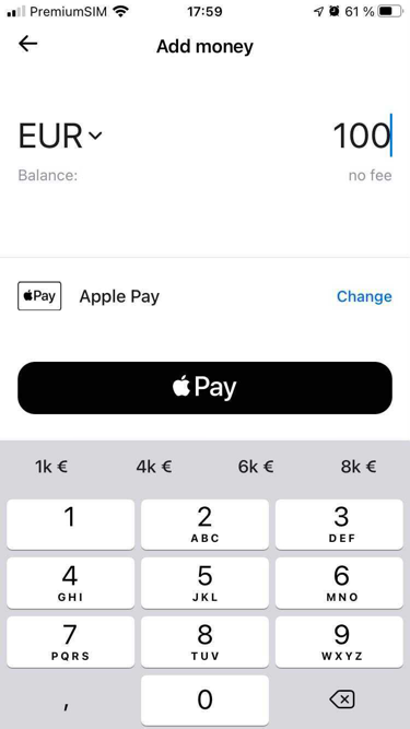 애플 페이를 이용해서 모자란 금액만큼 돈을 레볼루트 계좌로 넣었습니다.